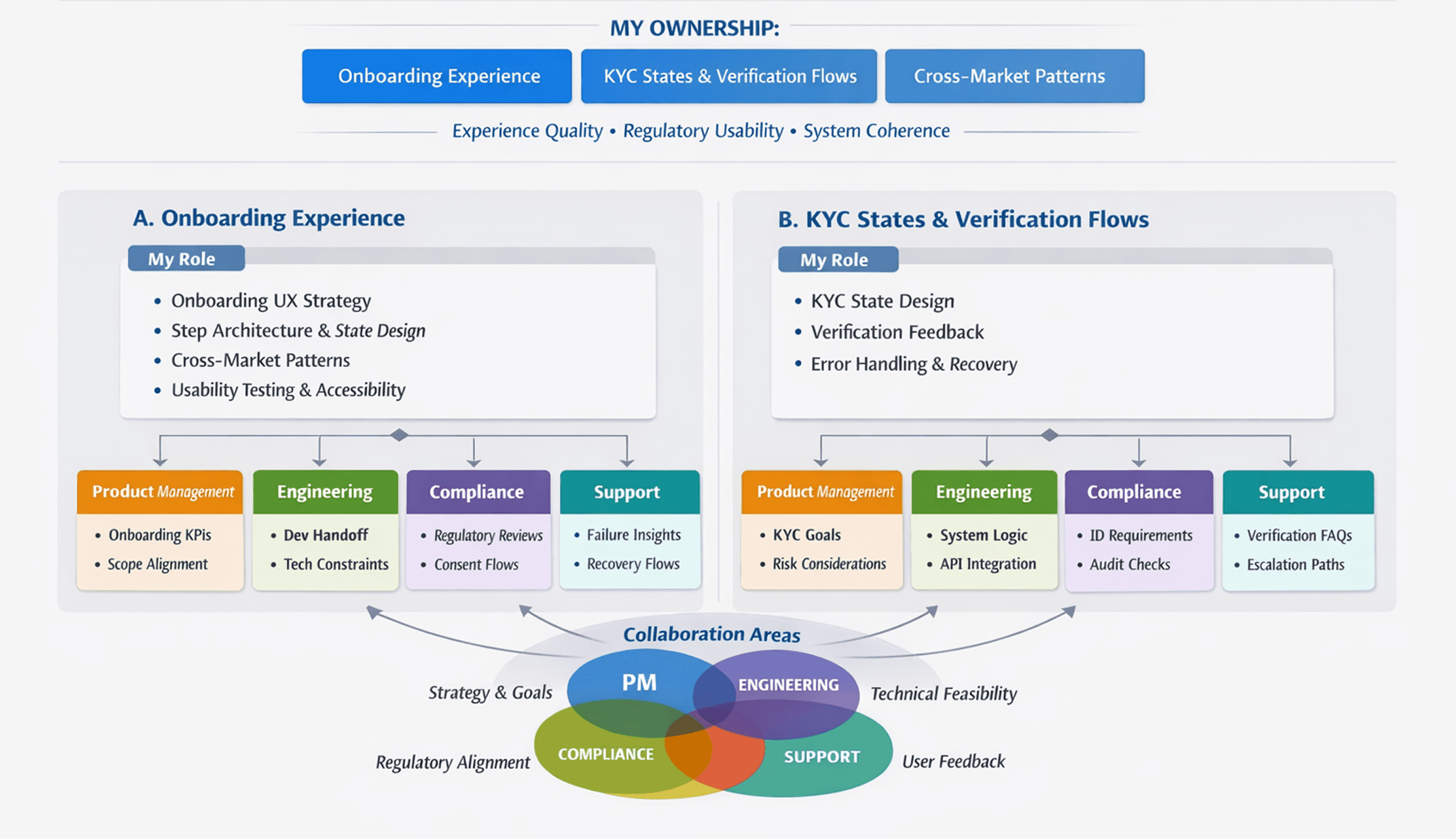 A responsibility map showing my ownership across onboarding, KYC and cross-market patterns with touchpoints to PM, Engineering, Compliance and Support